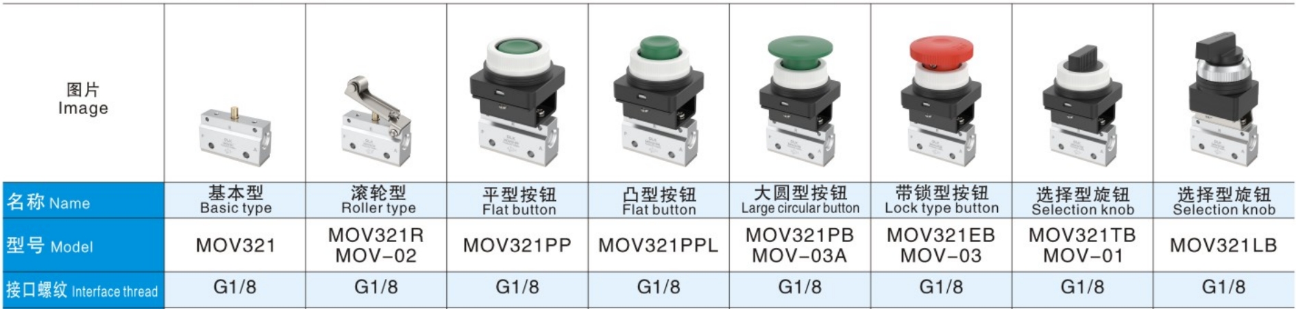 Клапан серии MOV321 может управлять цилиндрами одностороннего действия с диаметром интерфейса M5 и G1/8. P означает впуск, A — выпуск, а выпускное отверстие расположено на толкателе.