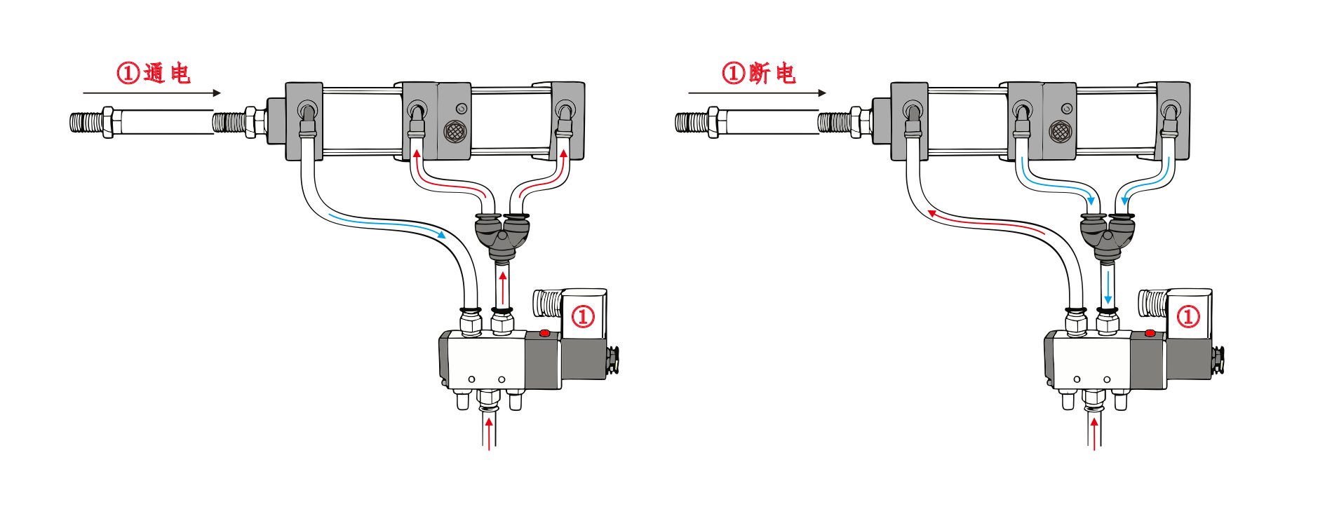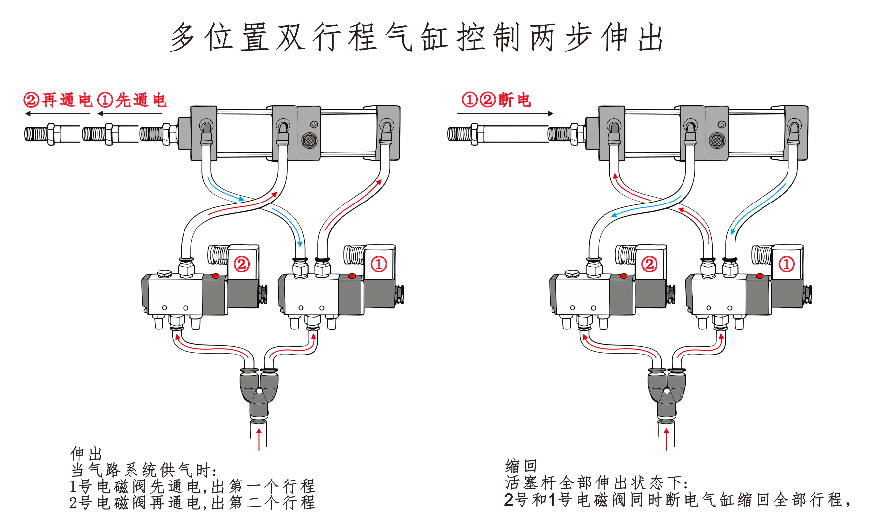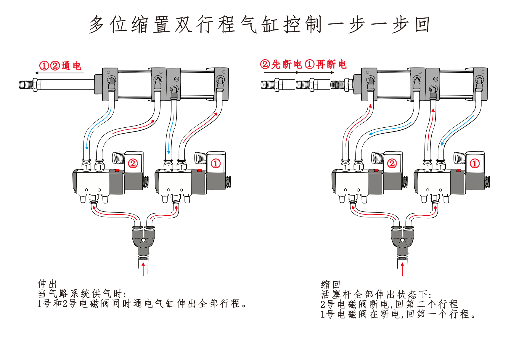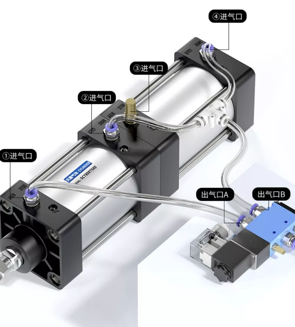 Воздухозаборник цилиндра ① подключен к порту A электромагнитного клапана, а воздухозаборник цилиндра ④ подключен последовательно к порту B электромагнитного клапана. Воздухозаборник цилиндра ③ соединен с глушителем. Когда на порт А электромагнитного клапана подается напряжение, цилиндры остаются во втянутом положении. Когда на порт B подается напряжение, цилиндры начинают работать.